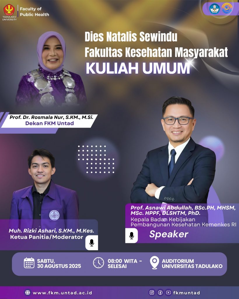 Fakultas Kesehatan Masyarakat (FKM) Universitas Tadulako kembali menghadirkan kegiatan kuliah umum dengan tema “Membentuk Generasi Go Healthy Melalui Kampus Berdampak Menuju Indonesia Emas” pada Sabtu (30/08/2025). Kegiatan ini menghadirkan narasumber utama Prof. Asnawi Abdullah, BSc.PH, MHSM, MSc. HPPF, DLSHTM, PhD., Kepala Badan Kebijakan Pembangunan Kesehatan Kementerian Kesehatan RI, dengan moderator Muh. Rizki Ashari, SKM., M.Kes.
